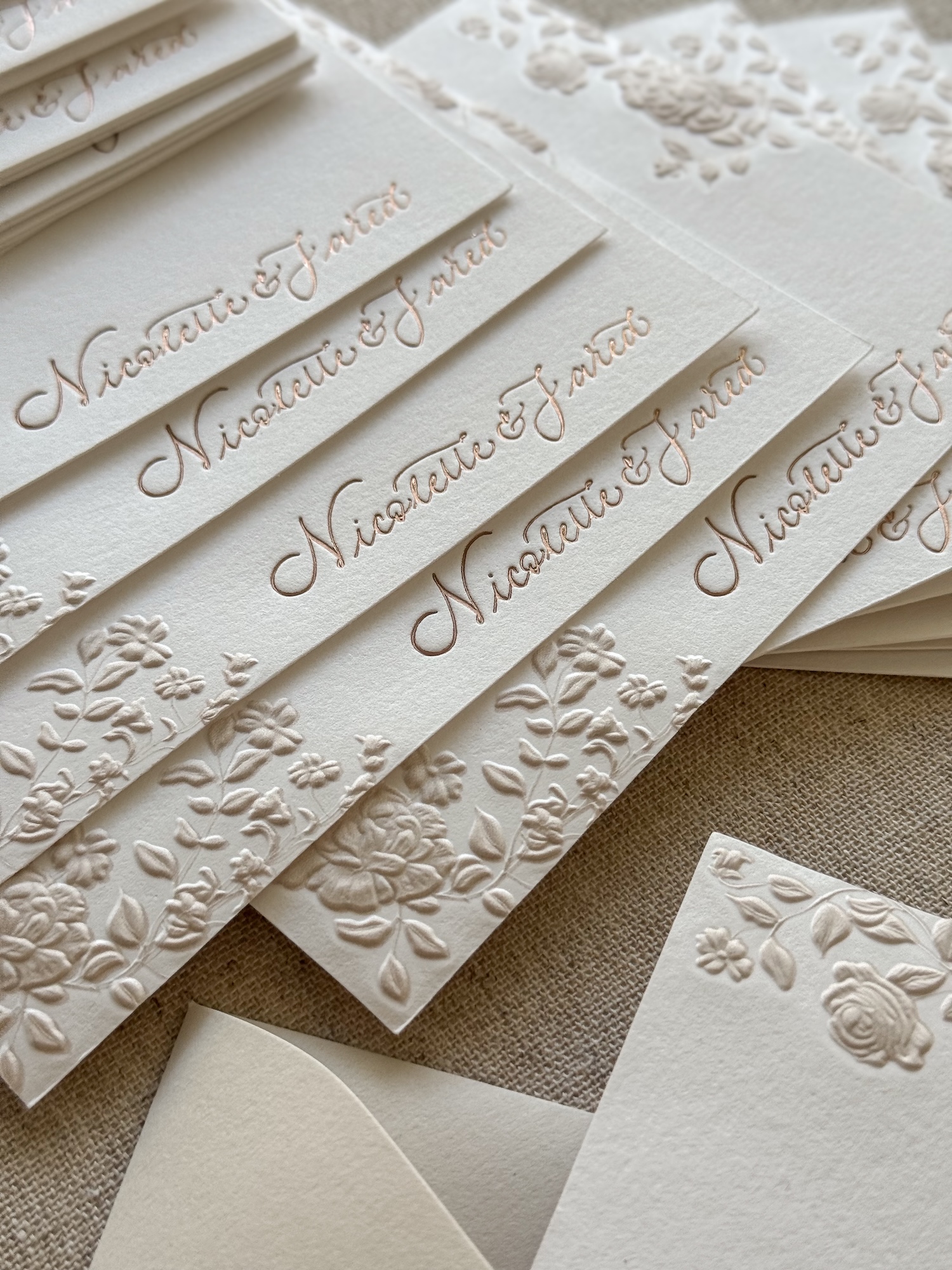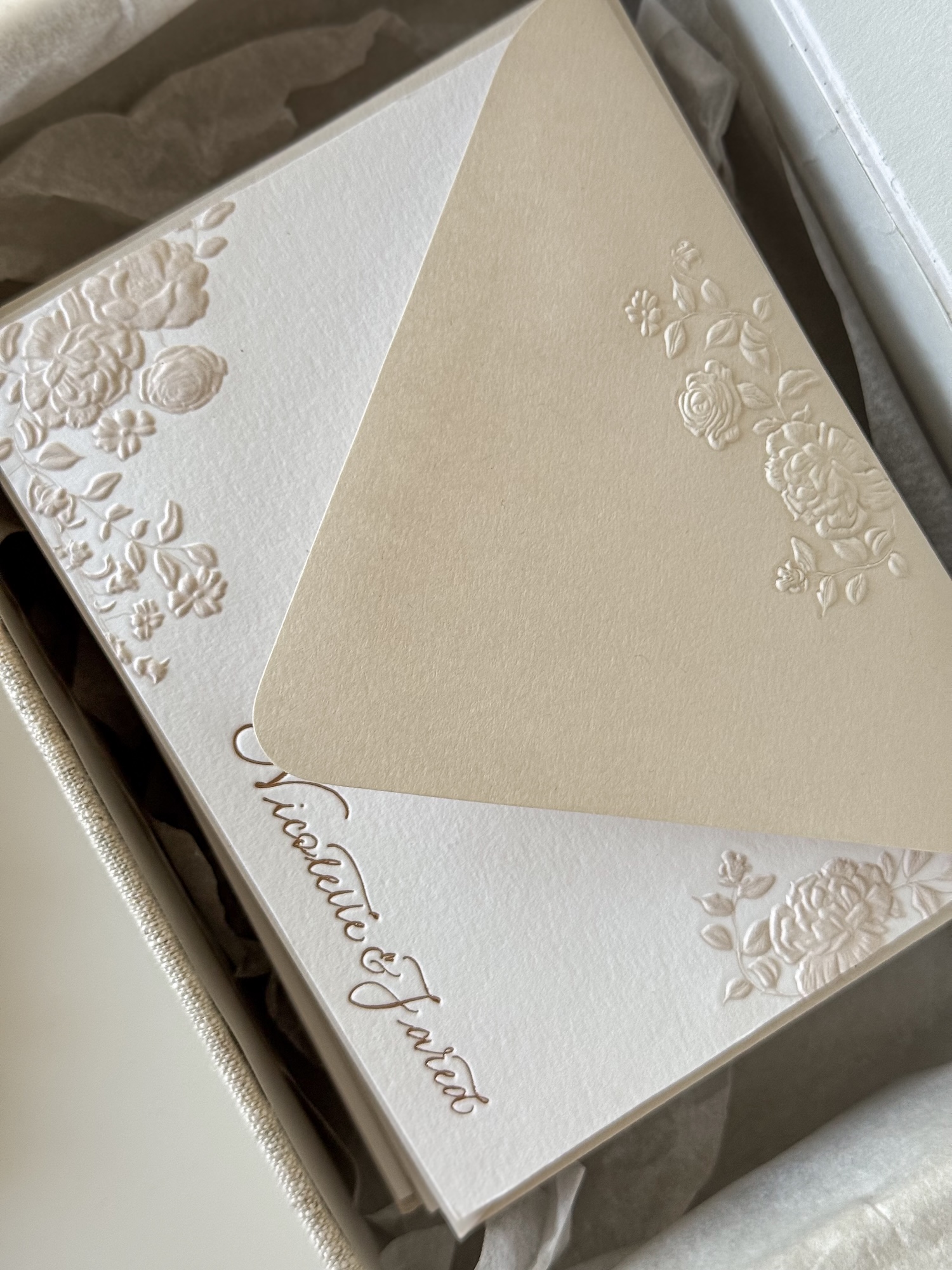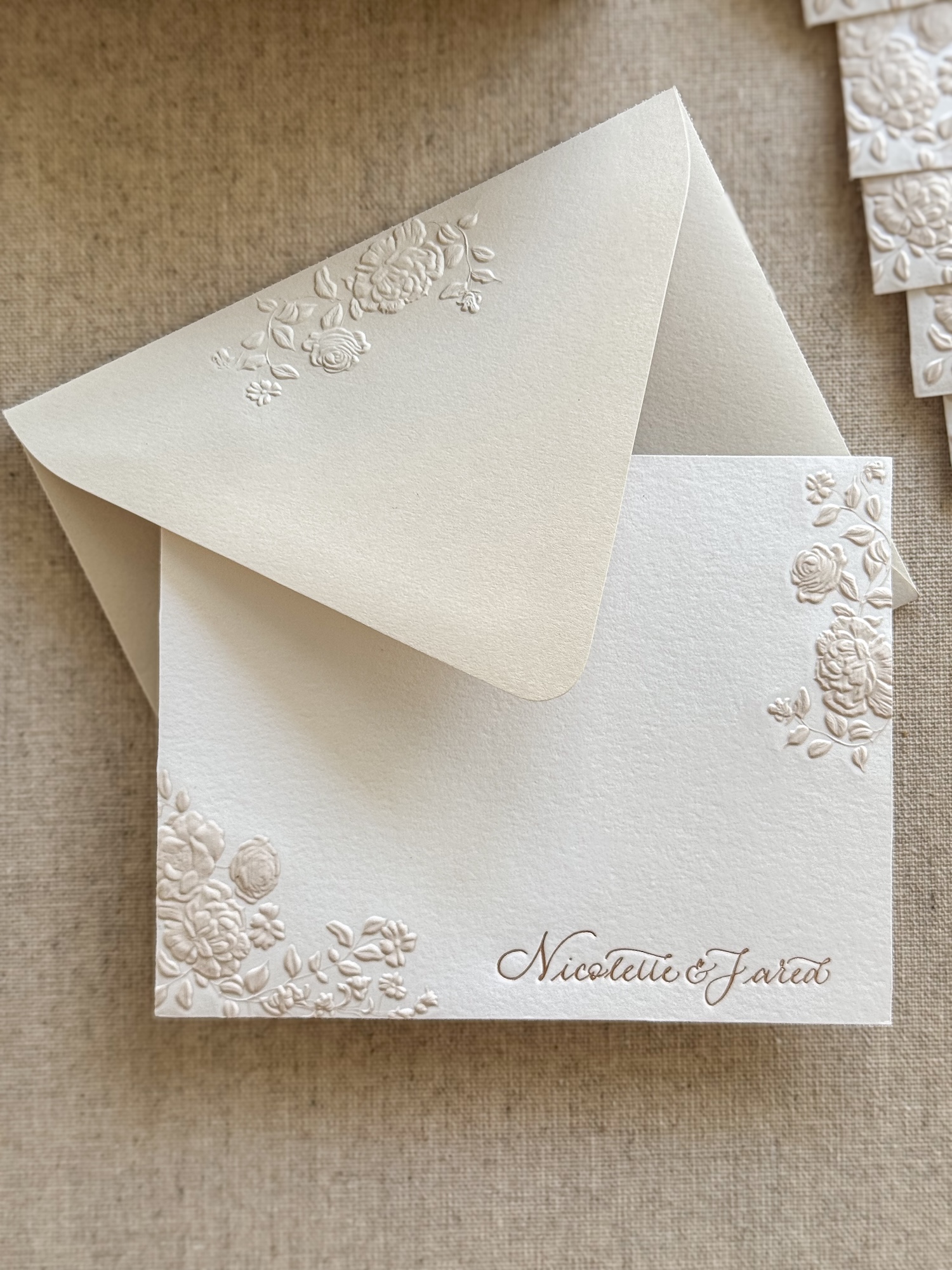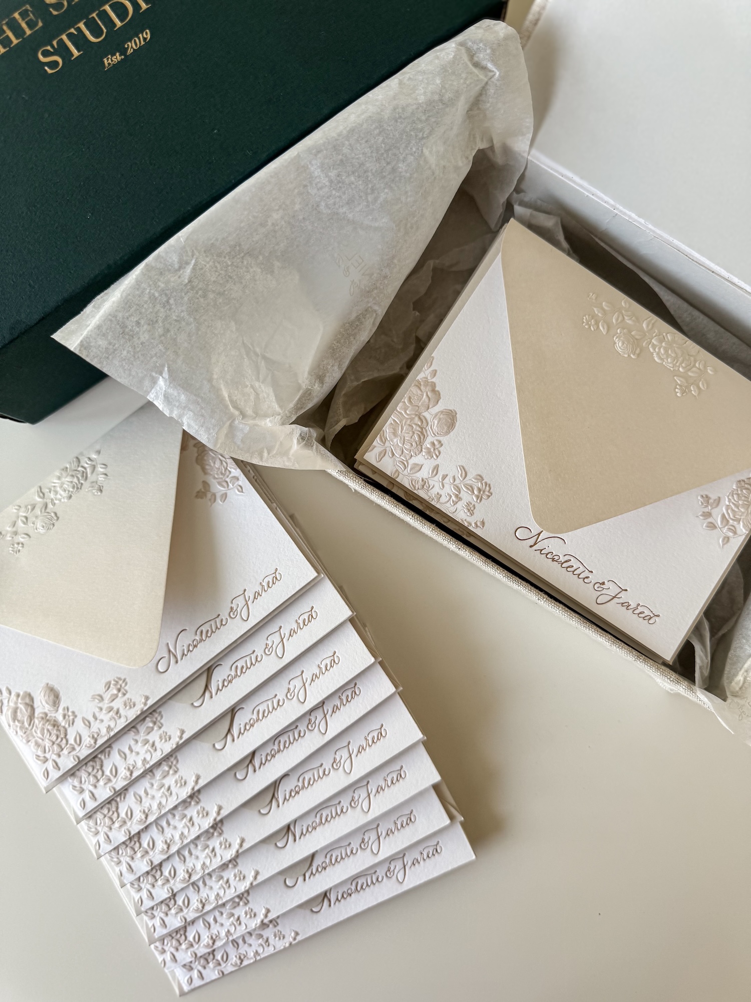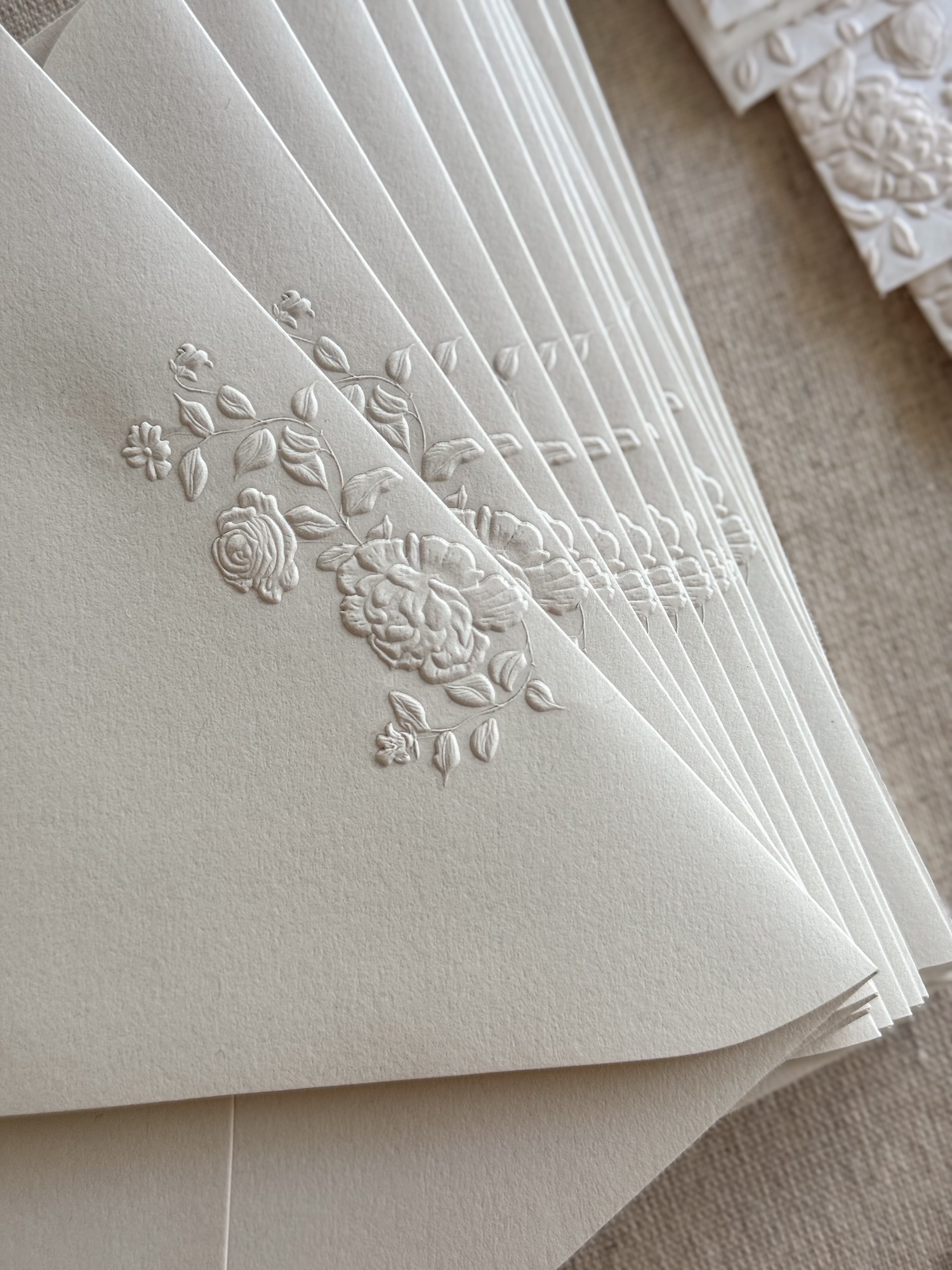 An elegant set of 25 personalized A2 cards & envelopes, printed in foil letterpress on luxurious 110 lb cover weight, 100% cotton paper. Both the cards and the envelopes feature a refined floral sculpted embossing. Presented in an exclusive 100% linen box, designed and produced in my studio especially for these sets.