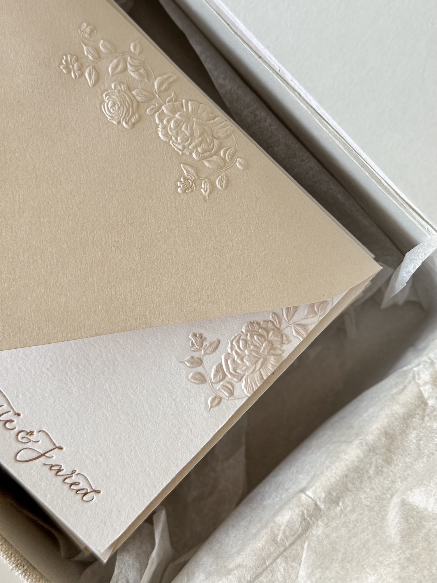 For each set, I personally calligraph your names in my signature style. The lettering is then carefully digitized and printed using foil letterpress, a traditional technique that creates a luminous finish with a delicate tactile impression.