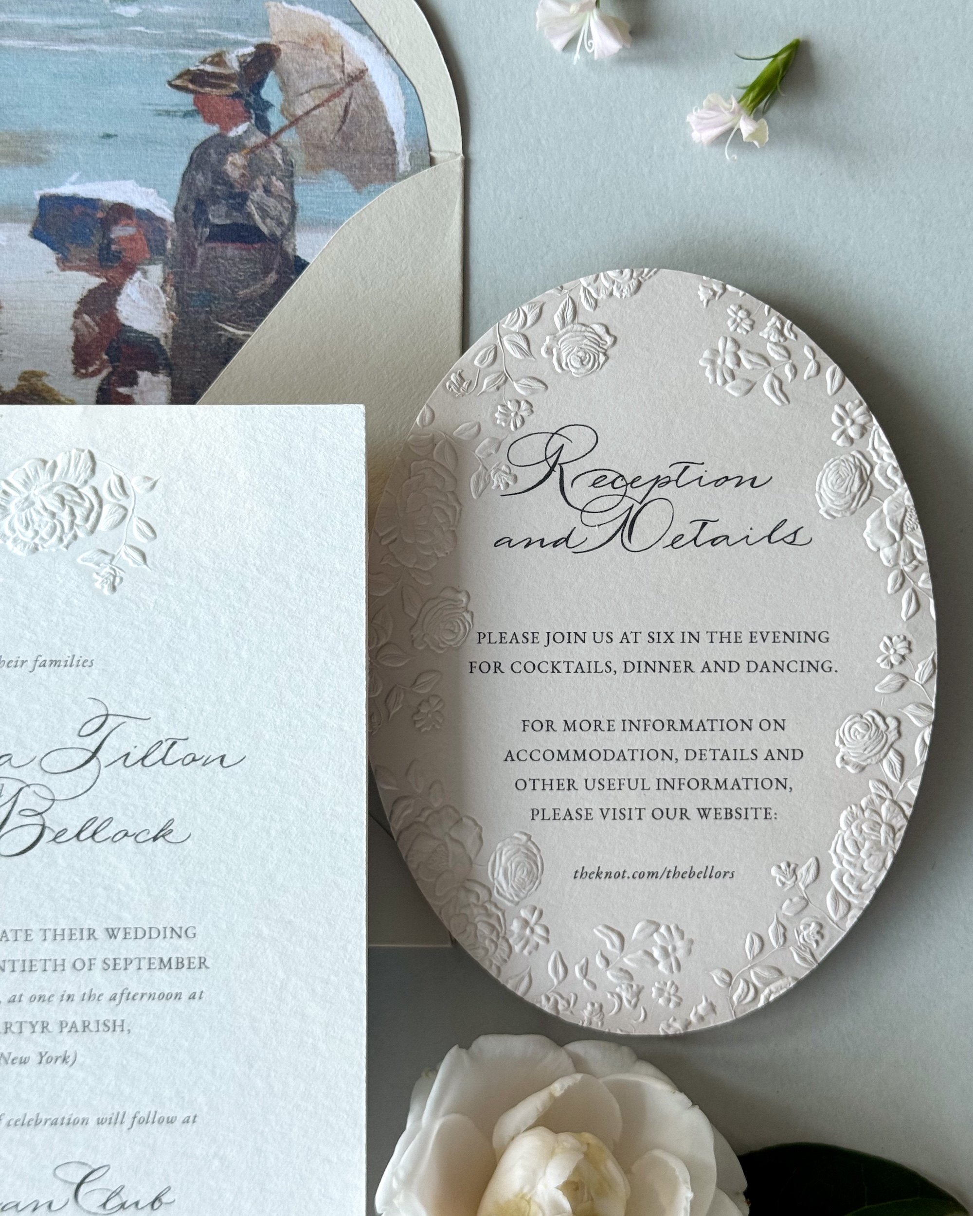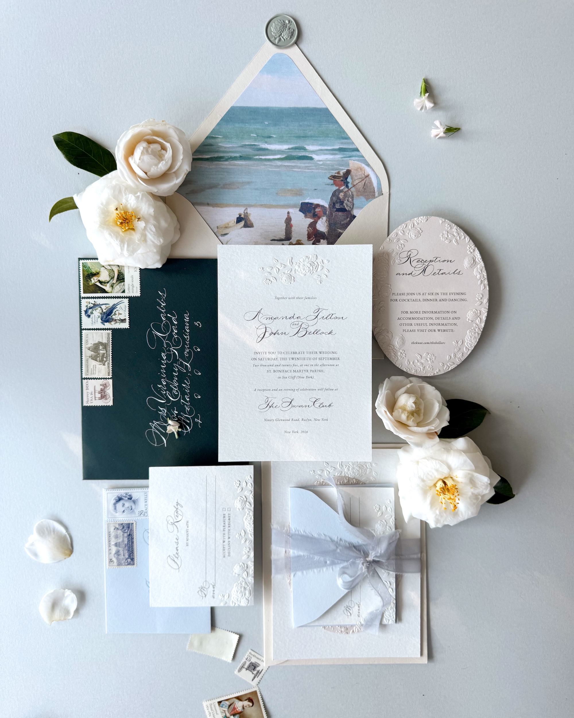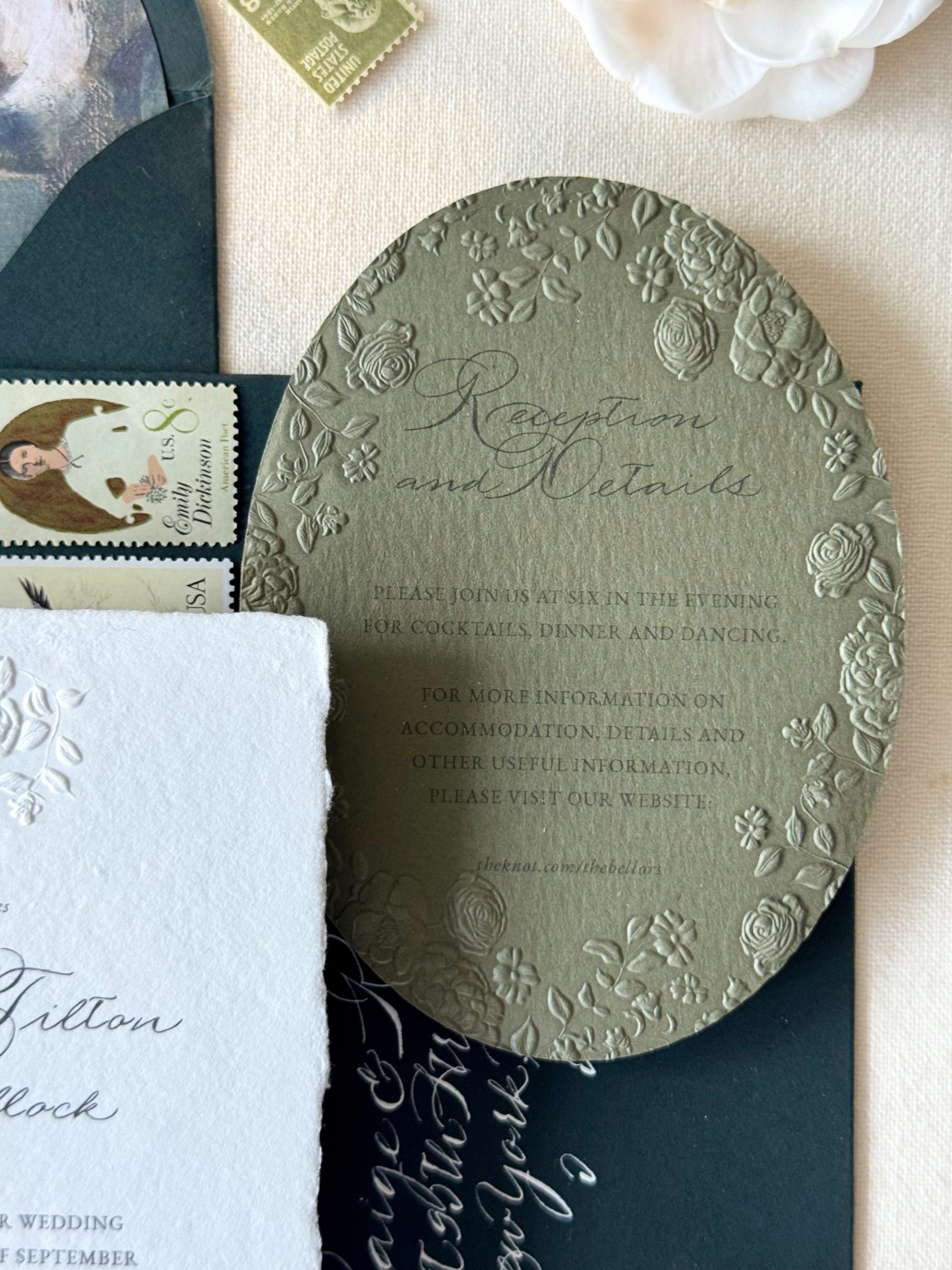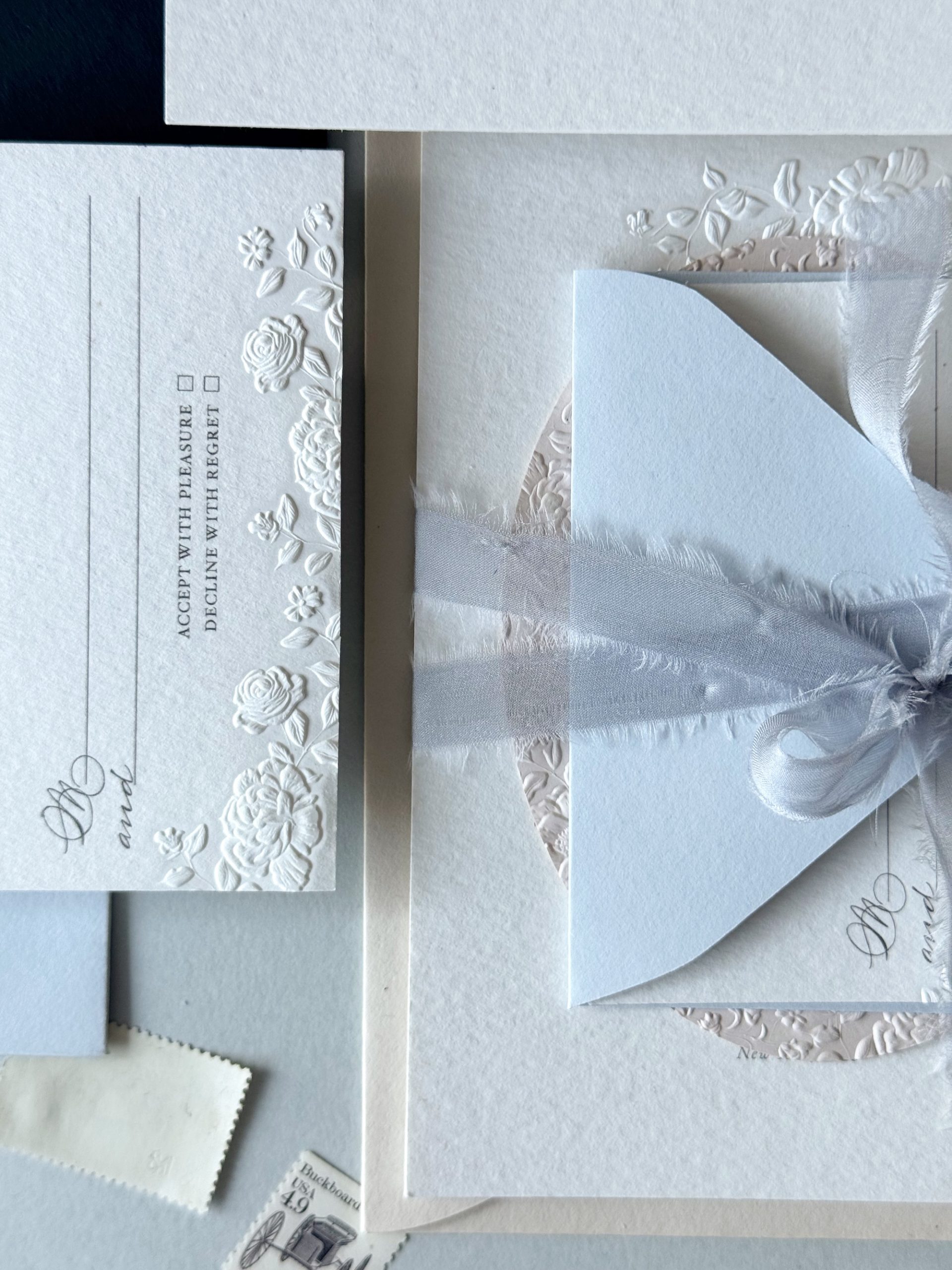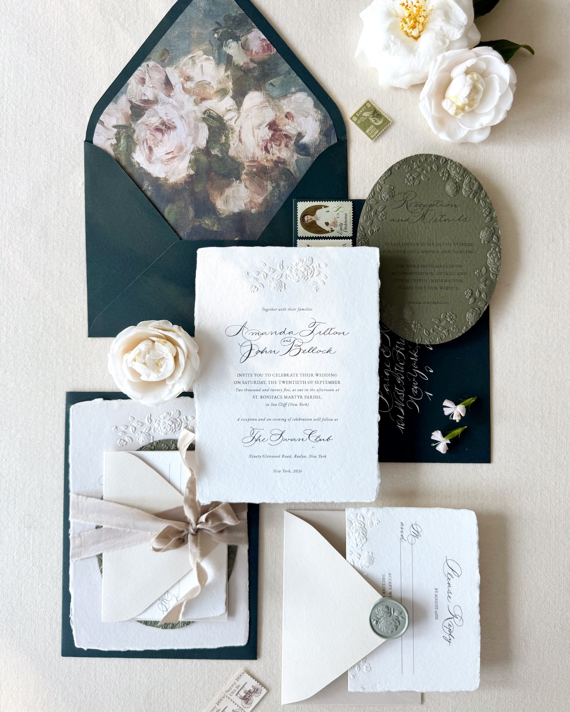 Inspired by the Emerald Coast, this new semi-custom collection embodies effortless sophistication and timeless beauty. At its heart, a stunning sculpted embossed floral frame (featuring peonies, roses, camellias, and other delicate blooms) adds depth, texture, and an unmistakable sense of artistry. Designed to elevate your wedding stationery, this collection is meant to captivate at first glance and leave a lasting impression on your guests.
