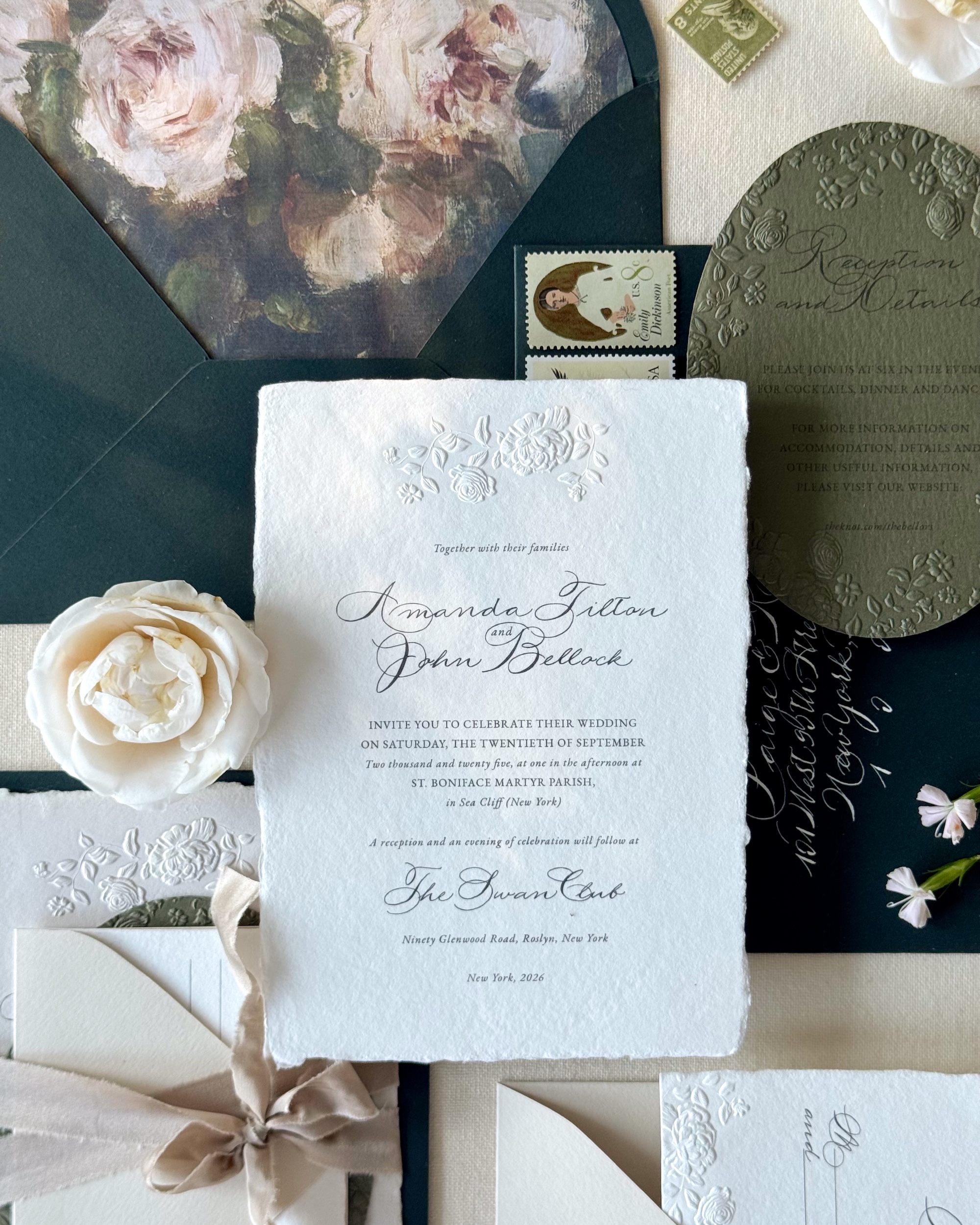 Each semi-custom suite is thoughtfully personalized to reflect your unique celebration, with carefully curated choices in color palette, fine papers, printing method, envelope liners, and finishing details, ensuring every element tells your story beautifully and intentionally.