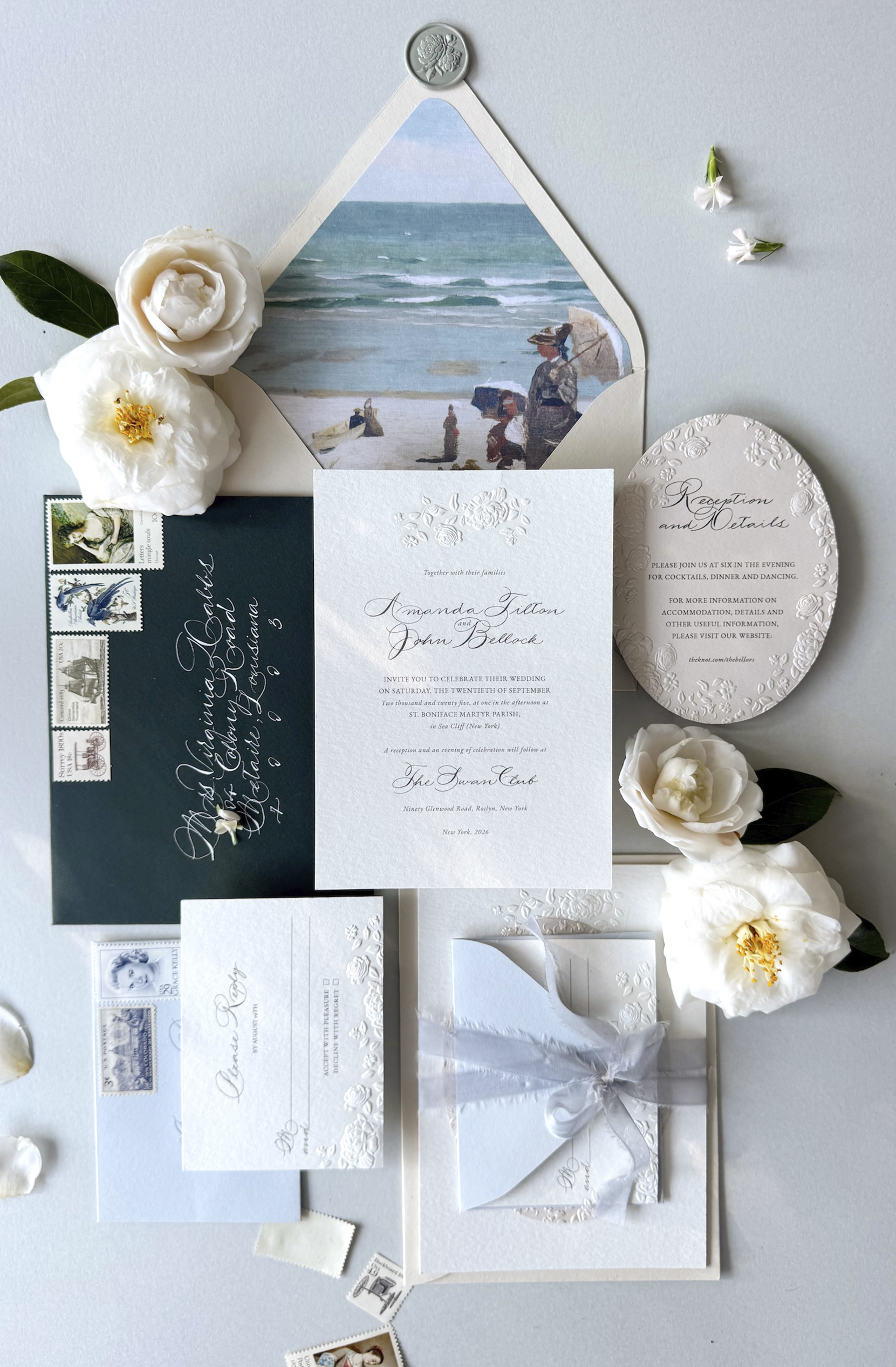 My fully custom wedding invitations are designed exclusively for each couple, with every detail created from the ground up. From concept and structure to paper, printing techniques, and bespoke embellishments, nothing is pre-designed or reused. Each suite is thoughtfully developed through a collaborative process, resulting in stationery that is deeply personal, intentional, and entirely one of a kind. The outcome is a cohesive collection that reflects your story with artistry and refinement, and sets the tone for your wedding in a truly distinctive way.